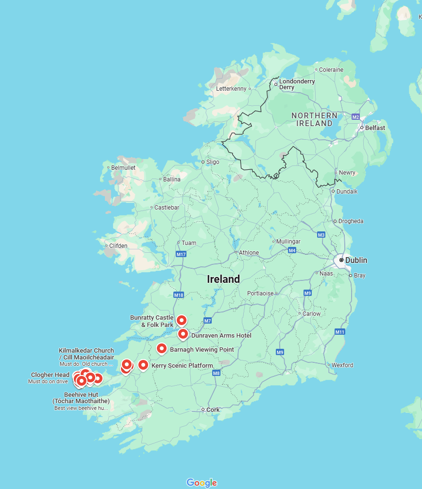 The Dingle Peninsula is where the concentration of red location markers is.